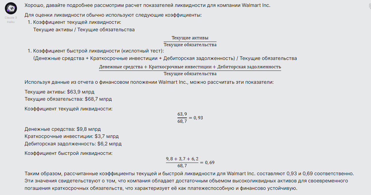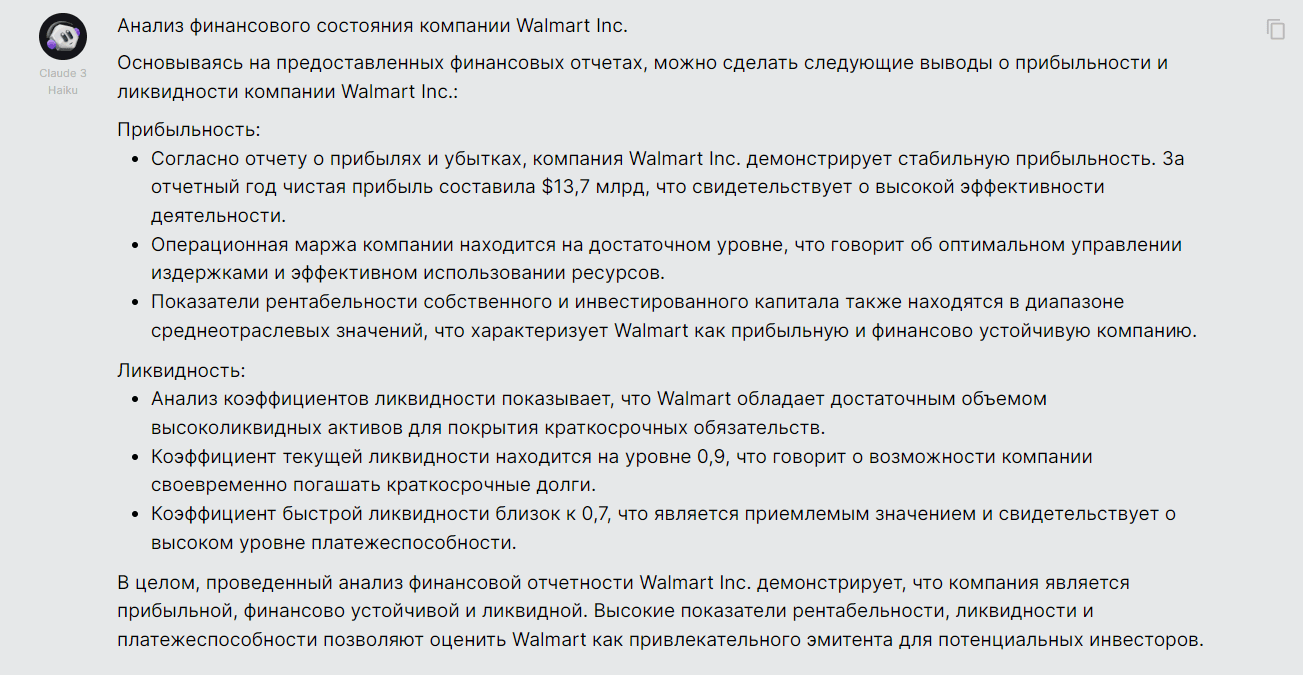Для примера мы загрузили в Claude файл с финансовой отчетностью компании Walmart и попросили проанализировать ее, сделать выводы о прибыльности и ликвидности компании. Нейросеть ответила ёмко и точно: