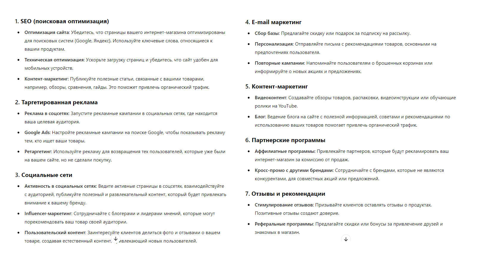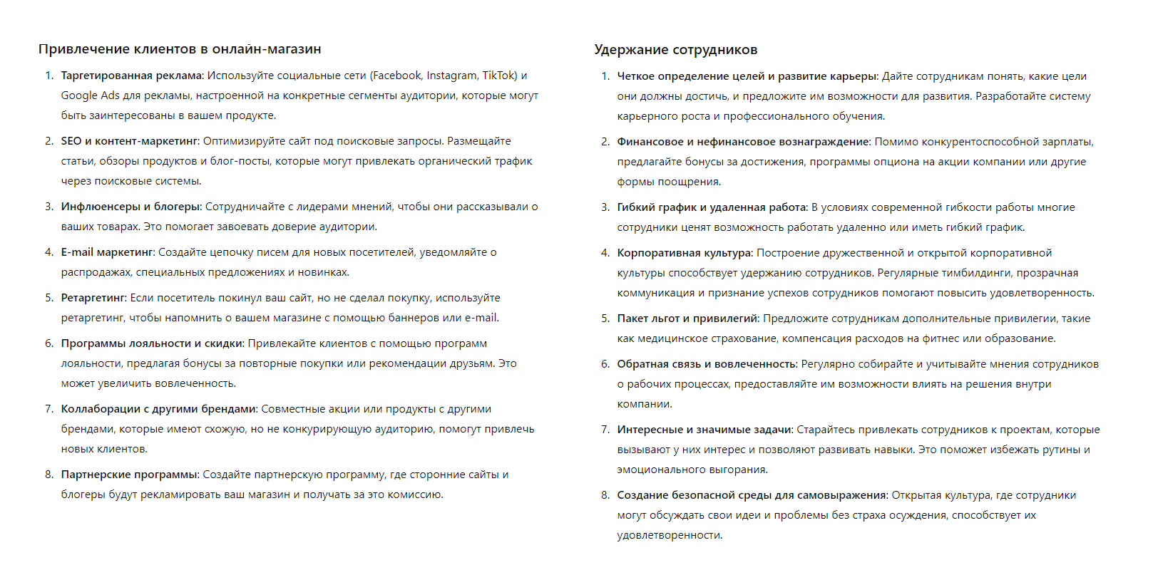 Для примера возьмем такой промпт: «Как лучше привлекать клиентов в онлайн-магазин и какие стратегии можно использовать для удержания сотрудников?». В запросе сразу два вопроса из разных областей. Нейросеть ответит на них поверхностно, как в примере ниже: