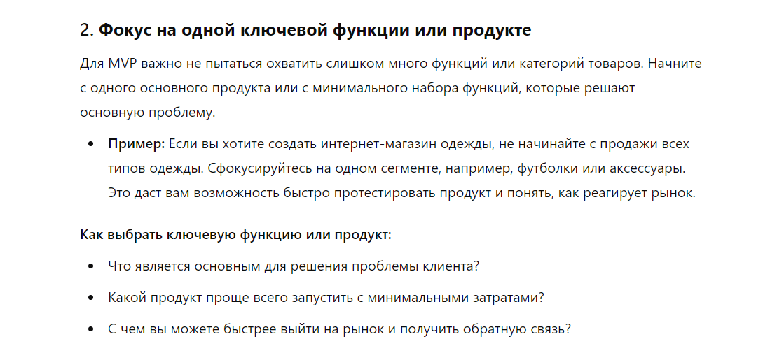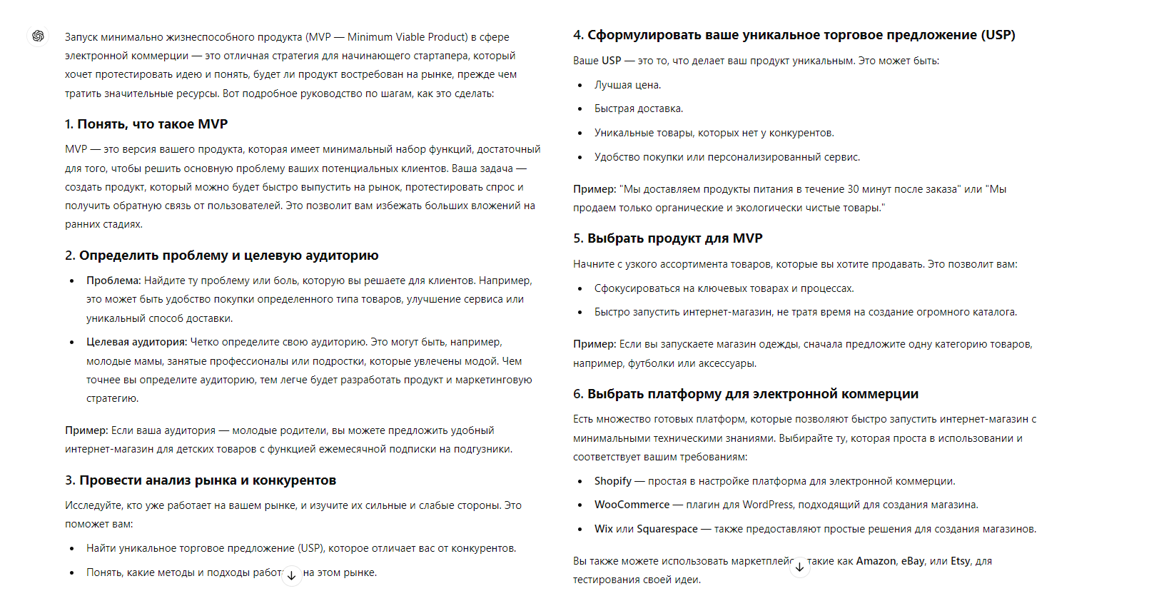 Для примера попросим нейросеть ChatGPT рассказать про минимально жизнеспособный продукт по промпту: «Расскажи, как запустить минимально жизнеспособный продукт в сфере электронной коммерции. Объясни все подробно для начинающего стартапера без опыта в бизнесе».