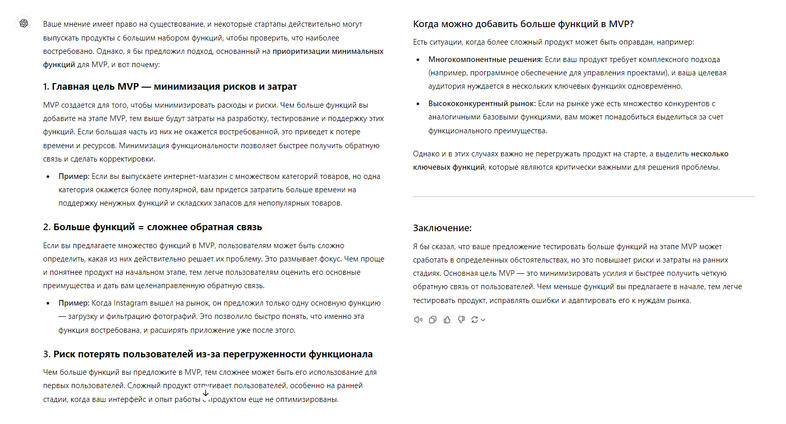 Выше — один из пунктов в ответе нейросети про выбор продукта для MVP. Допустим, мы не согласны и хотим поспорить. Отправим такой промпт: « Я с тобой не согласен. Для MVP можно выпускать продукты с большим набором функций. Как раз можно будет проверить, что больше всего нужно целевой аудитории, и в дальнейшем сделать акцент на этом. Скажи, прав я или нет и аргументируй свою позицию».
