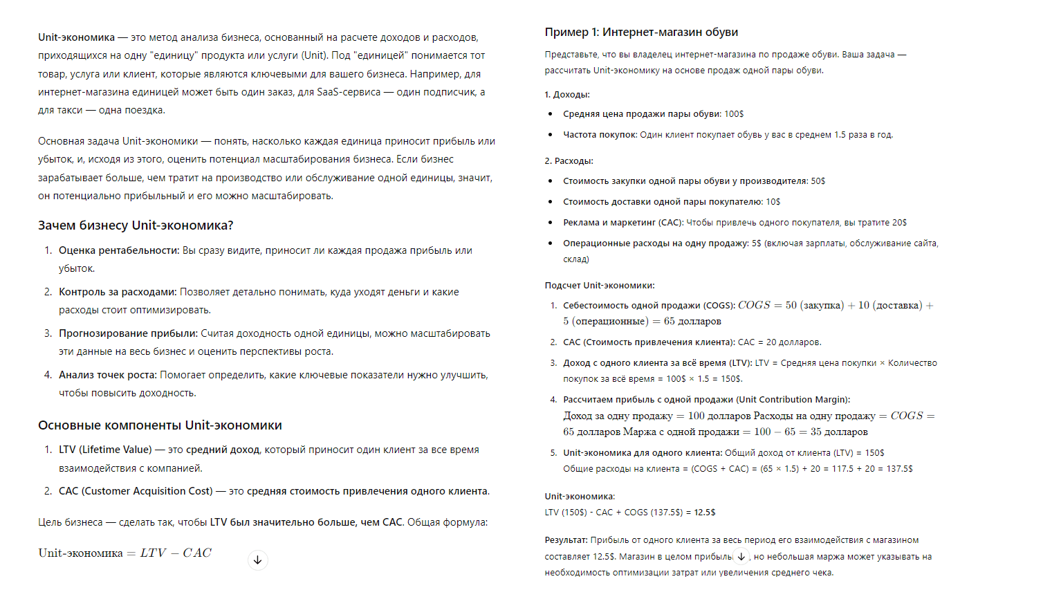 Допустим, мы хотим на конкретных примерах разобраться в юнит-экономике. Отправим в нейросеть такой запрос: «Ты — опытный предприниматель с навыками учителя, который терпеливо и доходчиво объясняет теорию своим ученикам. Объясни мне на примерах, что такое юнит-экономика и зачем она бизнесу. Приведи реальные примеры из практики предпринимателей, покажи детальные расчеты. После твоего ответа у меня не должно остаться никаких вопросов».