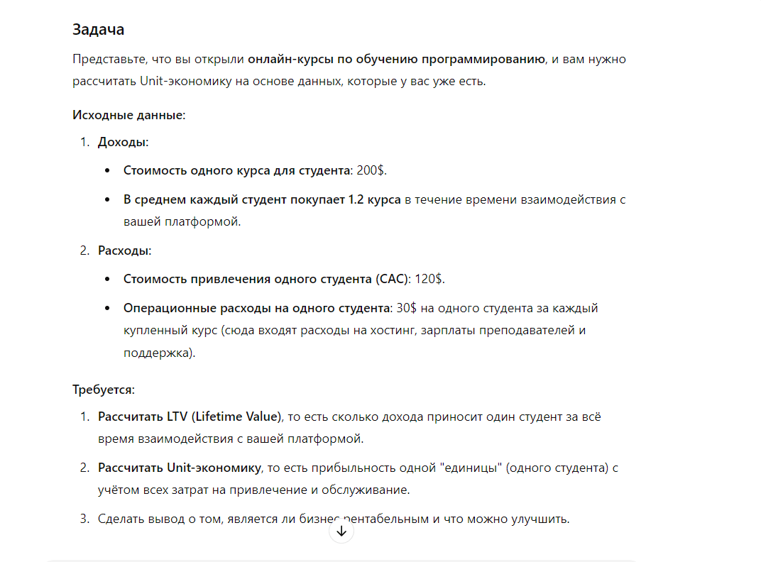 Теперь попросим придумать задачу, чтобы мы на практике отработали тему. Используем промпт: «Придумай мне задачу, чтобы я на практике закрепил юнит-экономику». Нейросеть составила такое задание:
