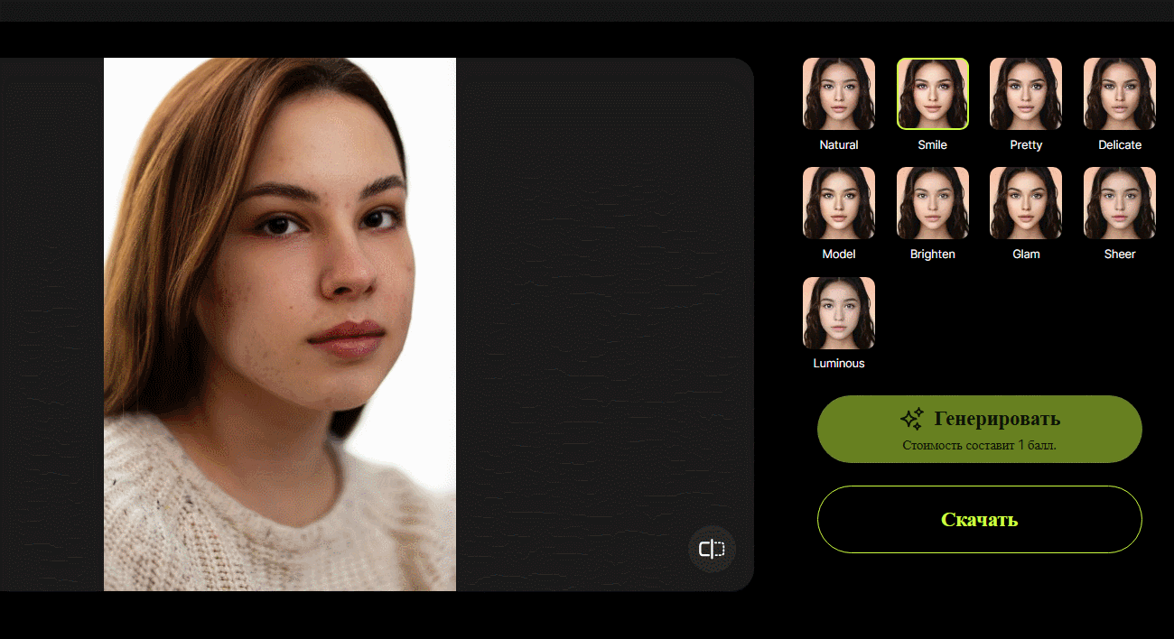 PhotoCat — это онлайн-редактор с функциями автоматической ретуши на базе искусственного интеллекта. Сервис позволяет быстро улучшить портреты: убрать дефекты кожи, сделать тон лица ровнее, подчеркнуть глаза и улыбку. Также есть инструменты для цветокоррекции и базового редактирования фотографий. Интерфейс русифицирован, а сама обработка занимает всего несколько секунд в автоматическом режиме. На каждую обработку тратится 1 кредит.