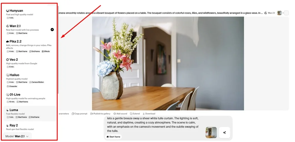 Попробуем создать видео для рекламы цветочного магазина. Возьмем фотографию букета на столе как стартовое изображение и напишем промпт с указанием движения камеры.