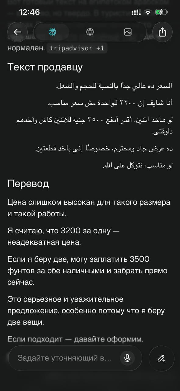 Дальше я попросил Perplexity написать на арабском встречное уважительное предложение — 4 000 за двоих — и показал текст на экране. Продавец ответил 5 000, потом скинул до 4 500. Я держался на 4 000 и попросил нейронку переписать мой текст чуть строже. Короче, сторговались на 4 000 фунтов вместо изначальных 6 400.