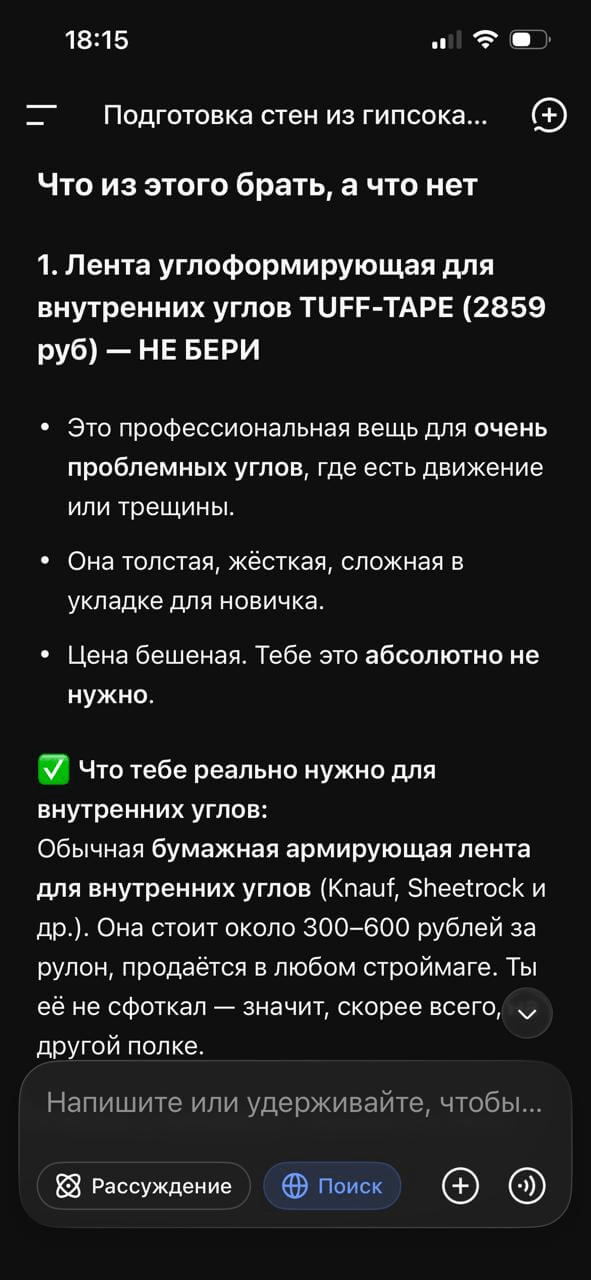 Поэтому перед поездкой в строительный магазин составил с нейронкой список всего, что понадобится для подготовки стен. А в самом магазине ходил между полками, фотографировал товары и просил нейронку тут же оценить каждый: стоит ли брать и почему.