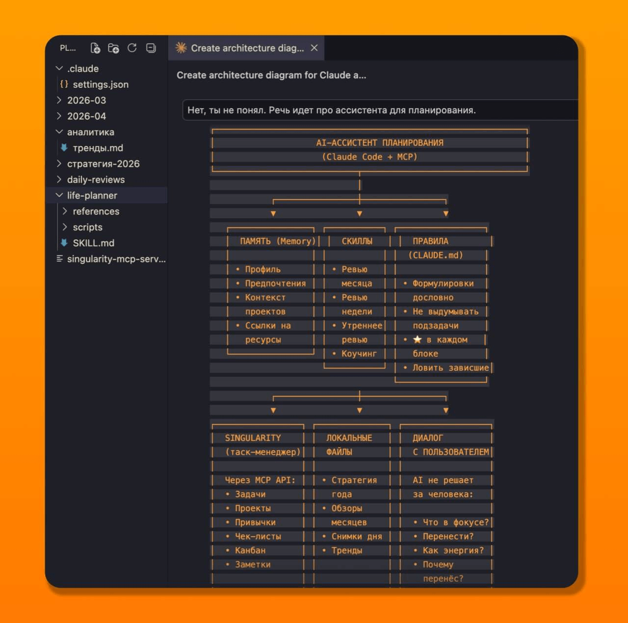Достигать цели я люблю, а вот рутинная часть с постановкой и планированием отнимает кучу времени. Поэтому я перевёл всю систему в Claude Code. Нейронка теперь сама смотрит в таск-менеджер, видит, как двигаются задачи, задаёт мне вопросы и проводит ревью. Раньше планирование месяца занимало около двух часов — сейчас справляюсь за сорок минут, причём прорабатываю все моменты глубже, потому что нейронка вытягивает рефлексию, которую я сам бы пропустил.