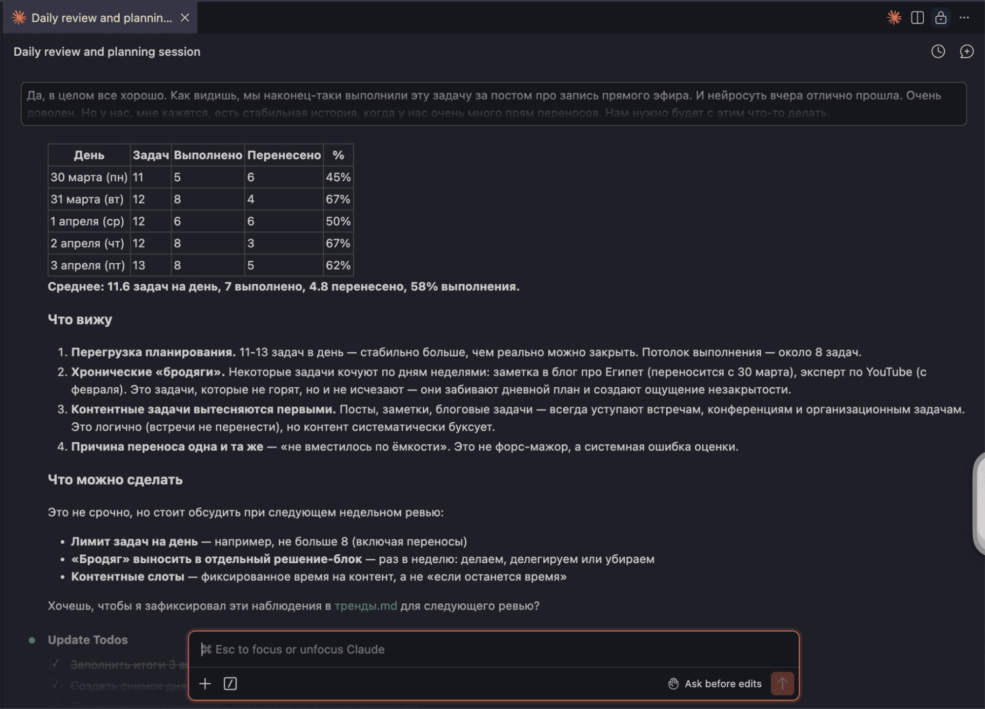 Прямо сейчас у меня параллельно работает агент, который смотрит, что вчера из задач выполнено, а что перенесено. Вчера, к слову, я закрыл всего 58% — не лучший показатель, но честный. Когда соберётся критическая масса таких ежедневных отчётов, буду анализировать, где систематически буксую и что стоит поменять в подходе.