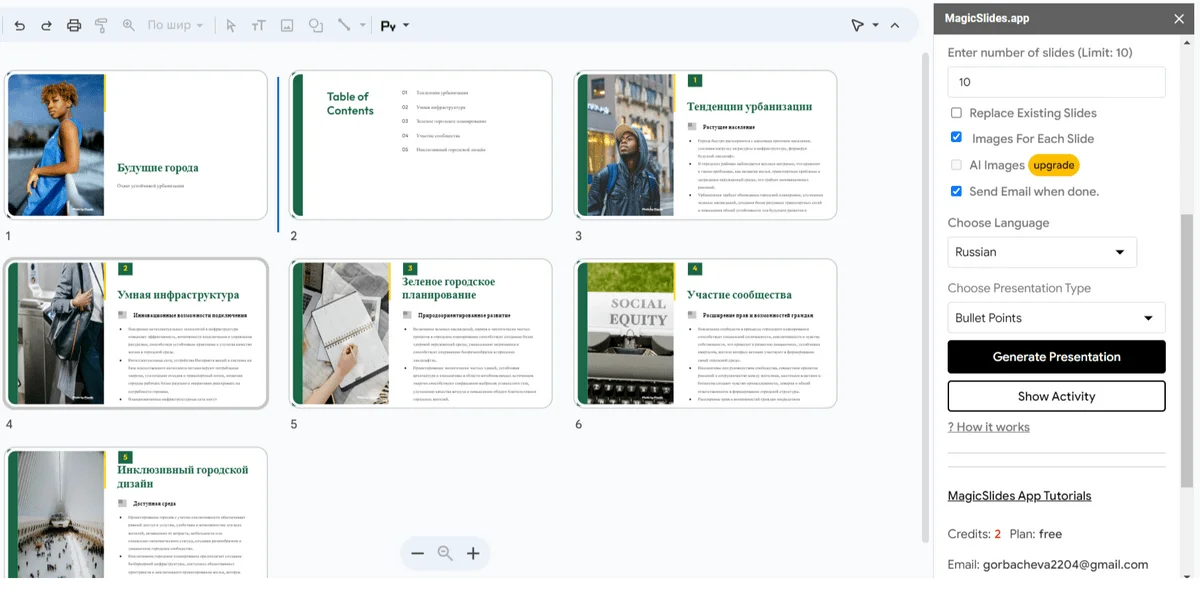 Нейросеть не генерирует иллюстрации сама — она подбирает их на Unsplash. Когда презентация готова, ее можно скачать в формате pdf или ppt.