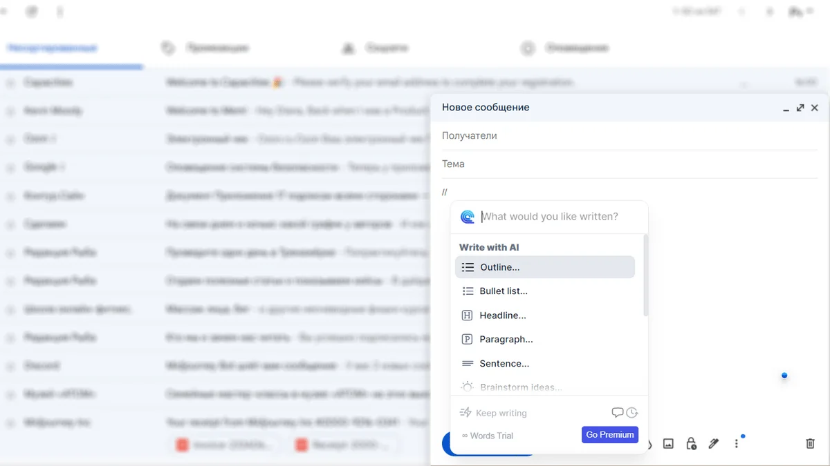 Чтобы составить письмо, наберите //, выберите формат — предложение, список, письмо, — и опишите задачу. Compose.ai работает не в любом окошке для набора текста, а только в поддерживаемых сервисах: Gmail, Notion, Discord, Google Документах.