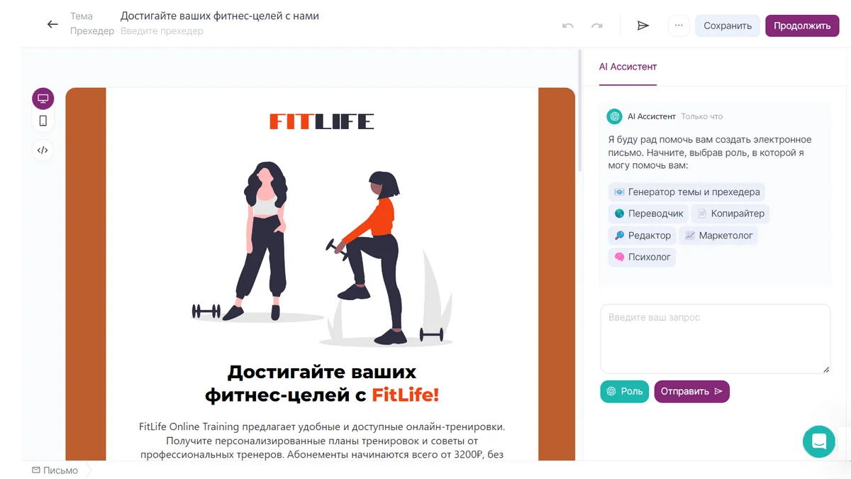 Что умеет. Это конструктор писем со встроенными помощниками: AI-ассистенты могут генерировать тексты, картинки, анализировать письма и оценивать их эффективность. Если работаете с рассылками, в конструкторе их сможете делать в разы быстрее.