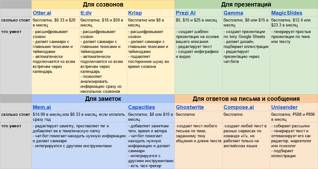 Мы сделали таблицу с кратким описанием всех виртуальных помощников из этой статьи. Оставили в ней ссылку на каждый сервис, чтобы вы сразу могли протестировать понравившийся.